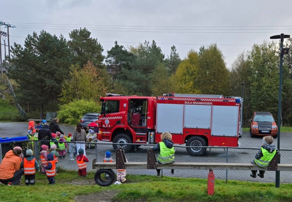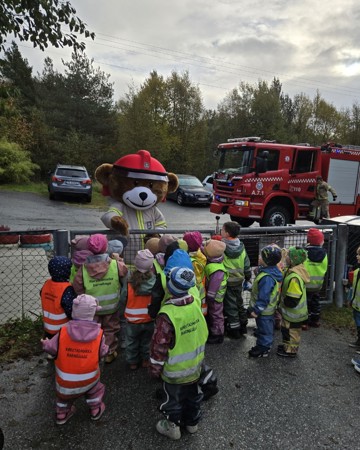 Barna var heilt klare til å ta i mot Bjørnis i barnehagen i dag. Mange av barna har sett han på TV, nokre har sett han på brannstasjonen og nokre kan hugse at han har besøkt barnehagen før. Med blålys, litt sirene og eit par klemt i fløyta rulla brannbilen inn på parkeringsplassen til barnehagen.