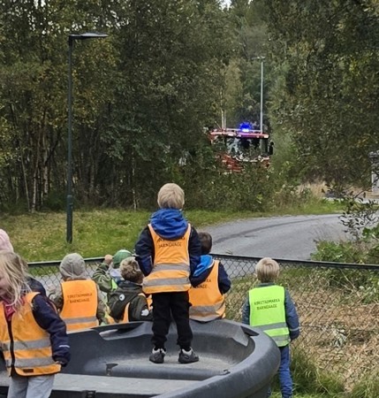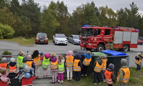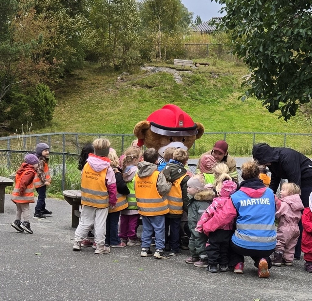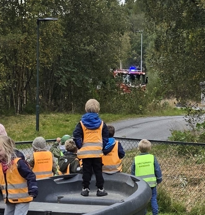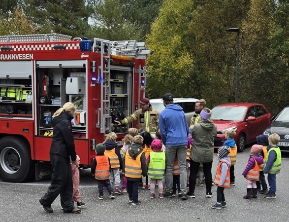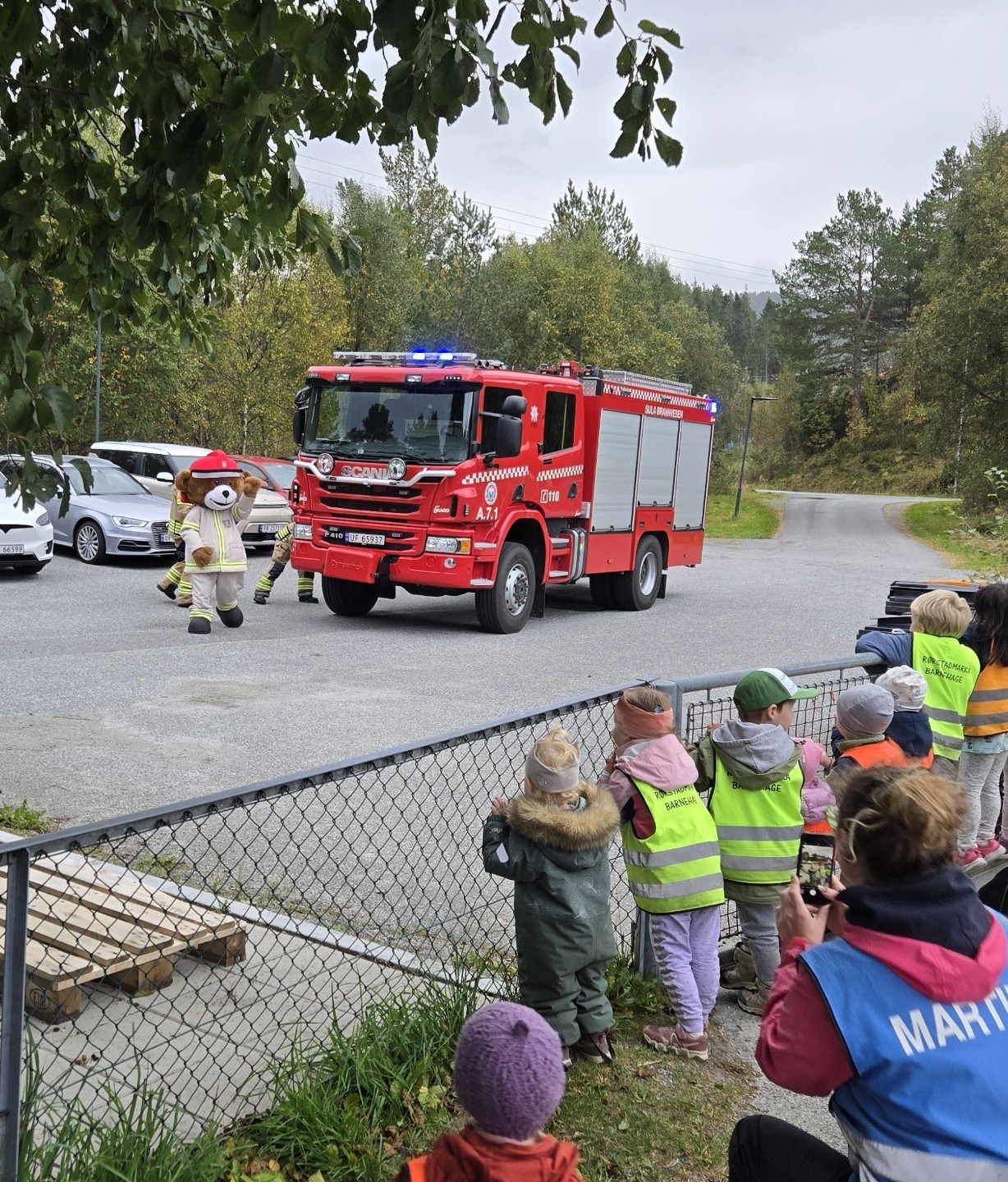 Barna har den siste tida lært mykje om brannvern i barnehagen, hatt brannøving, prata om brann og lest bøker om brannbamsen Bjørnis. Mange hugsar også bålet vi hadde på haustturen, og dei mange samtalane rundt bålet med Kristin som var bålsjefen den dagen.
