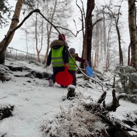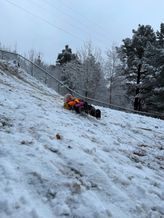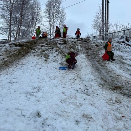 ENDELEG er det nok snø i akebakken på barnehagens uteområde til å leite fram rumpebretta. Frå toppen av akebakken får barna kjenne på skrekkblanda fryd der dei susar ned bakken i full fart. Det gir meirsmak, vegen opp igjen til toppen av bakken går lett og ingen ser at nesten all snøen blir aka bort.