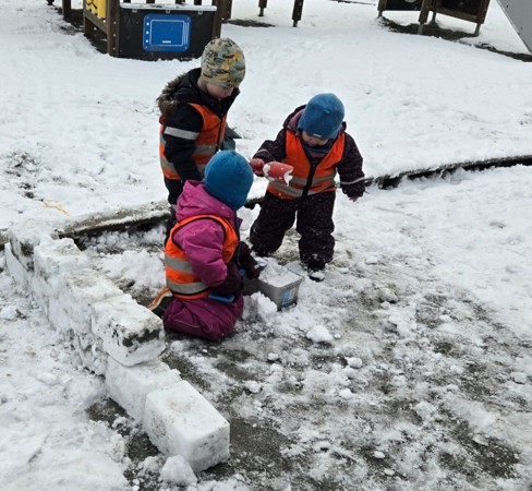 Den kramme snøen er enkel å forme med. Med litt hjelp frå dei vaksne byggast det snøborg. I samarbeid lagar dei perfekte mursteinar som dei bygger med.
