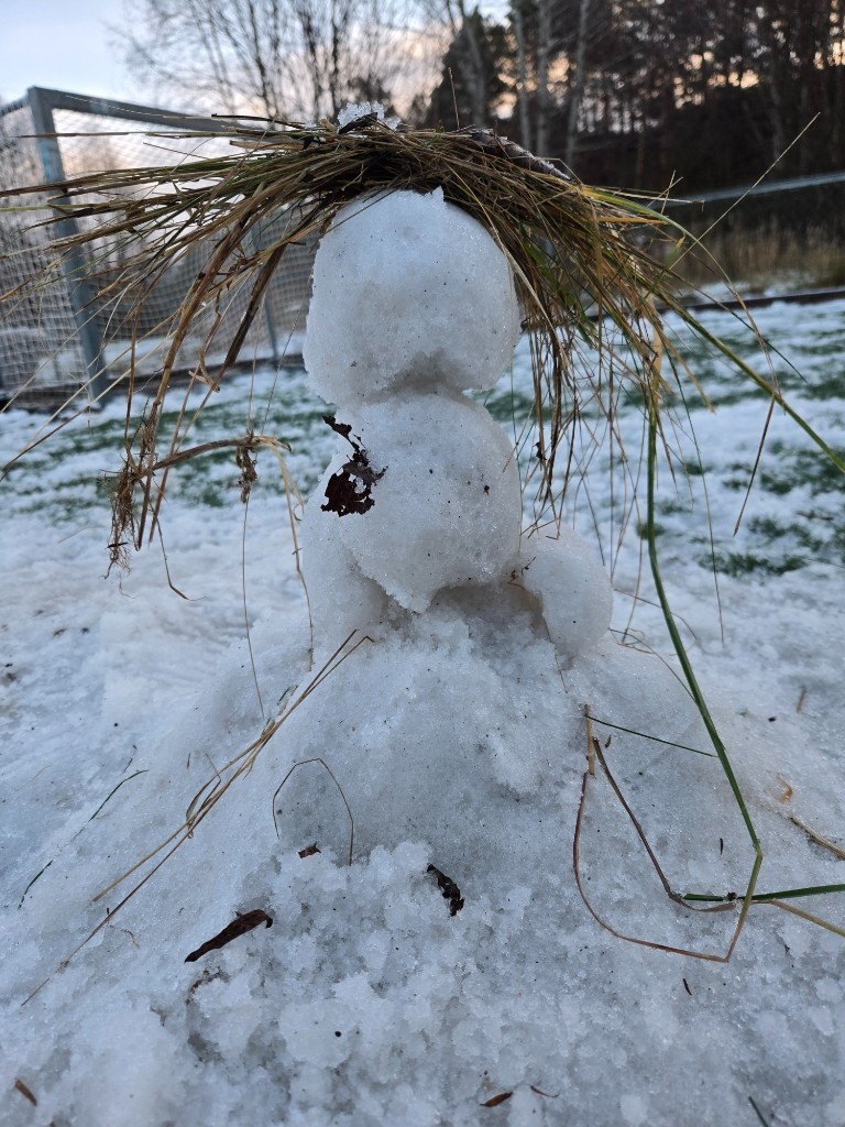 Styrar-Kristin er spesielt fornøyd med portrett-snømannen som er laga på fotballbana!