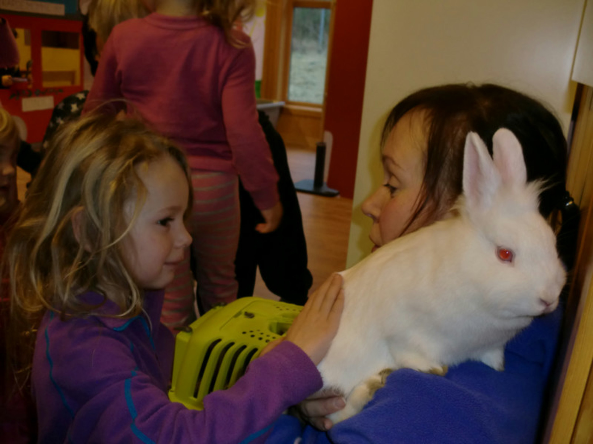 Barna prata om augefarge. Dei studerte kva for farge barna og dei vaksne har på sine auge, og augefargen til kaninene.