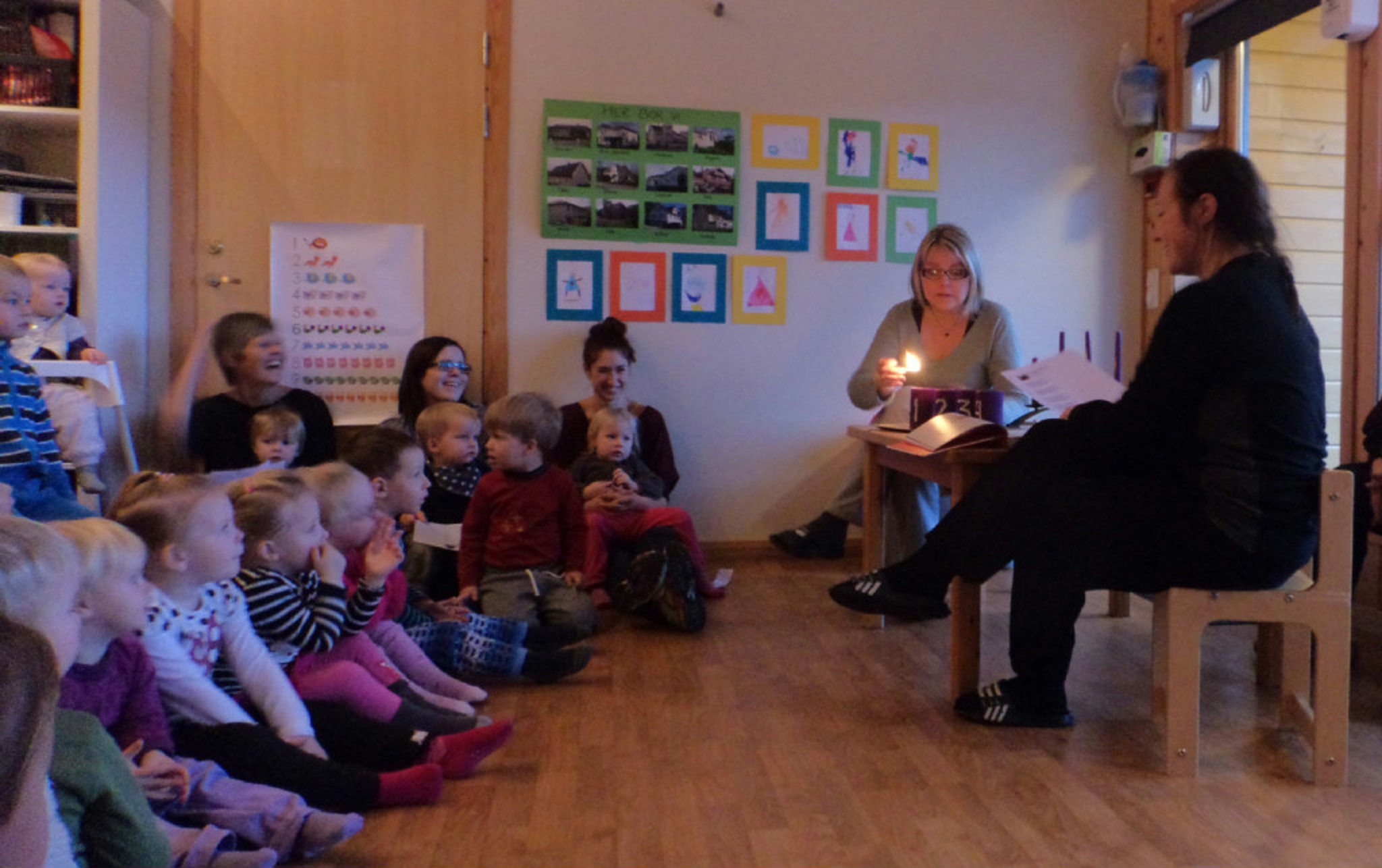 Denne første adventsamlinga var det avdelinga Bikuba som hadde ansvaret for. Wenche fortalde litt om adventstida, tente lys og drog igang allsang. Ei hyggeleg stund for alle, både dei heilt små, dei mellomstore og dei aller største.