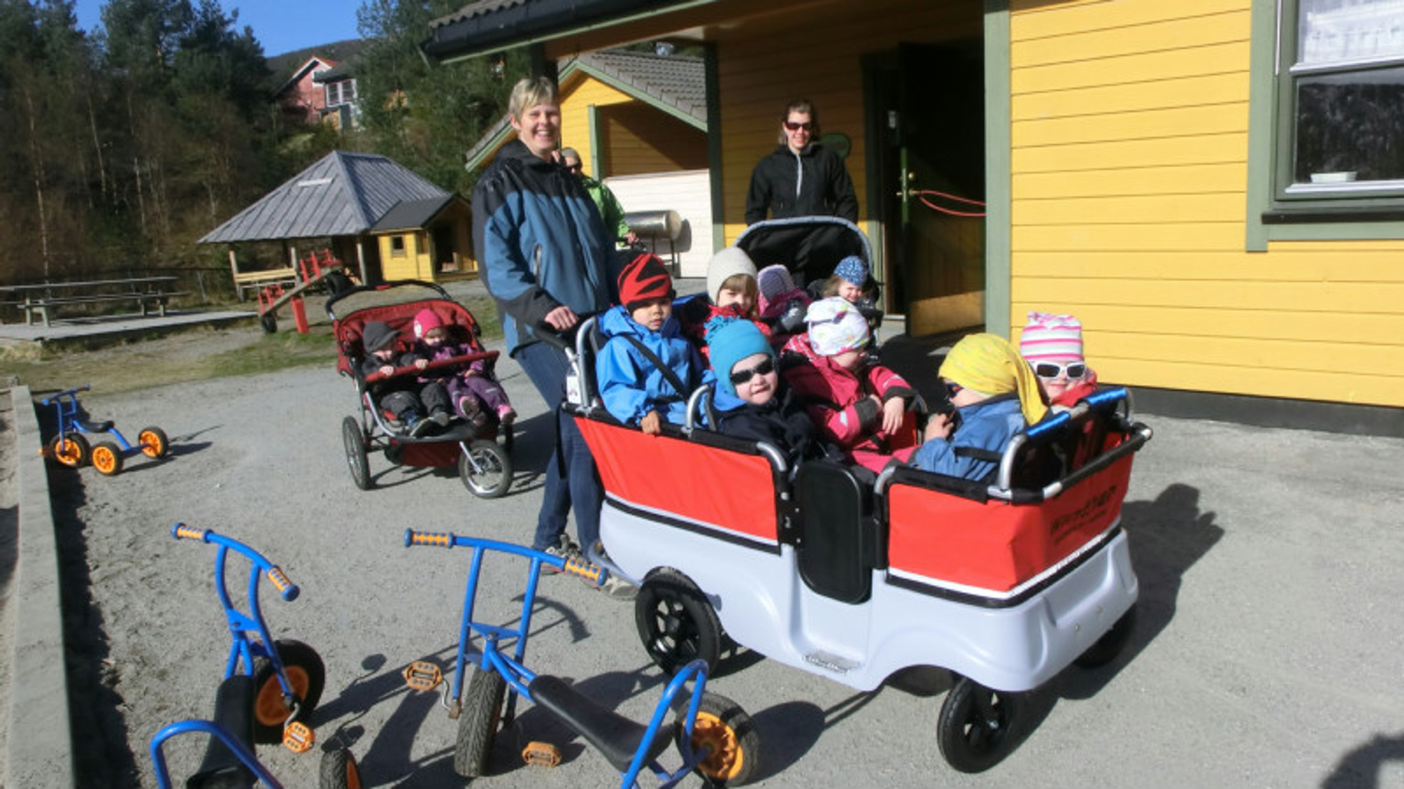 Avdelinga for dei minste barna på barnehagen har nyleg fått i hus den kjempestore vogna med plass til 6 barn. Barna på Marihøna er flinke og flittige til å gå turar på beina også, men med denne vogna kan ein sette seg turmål litt lengre unna. Barna lyt bytte på å gå og å kvile beina.