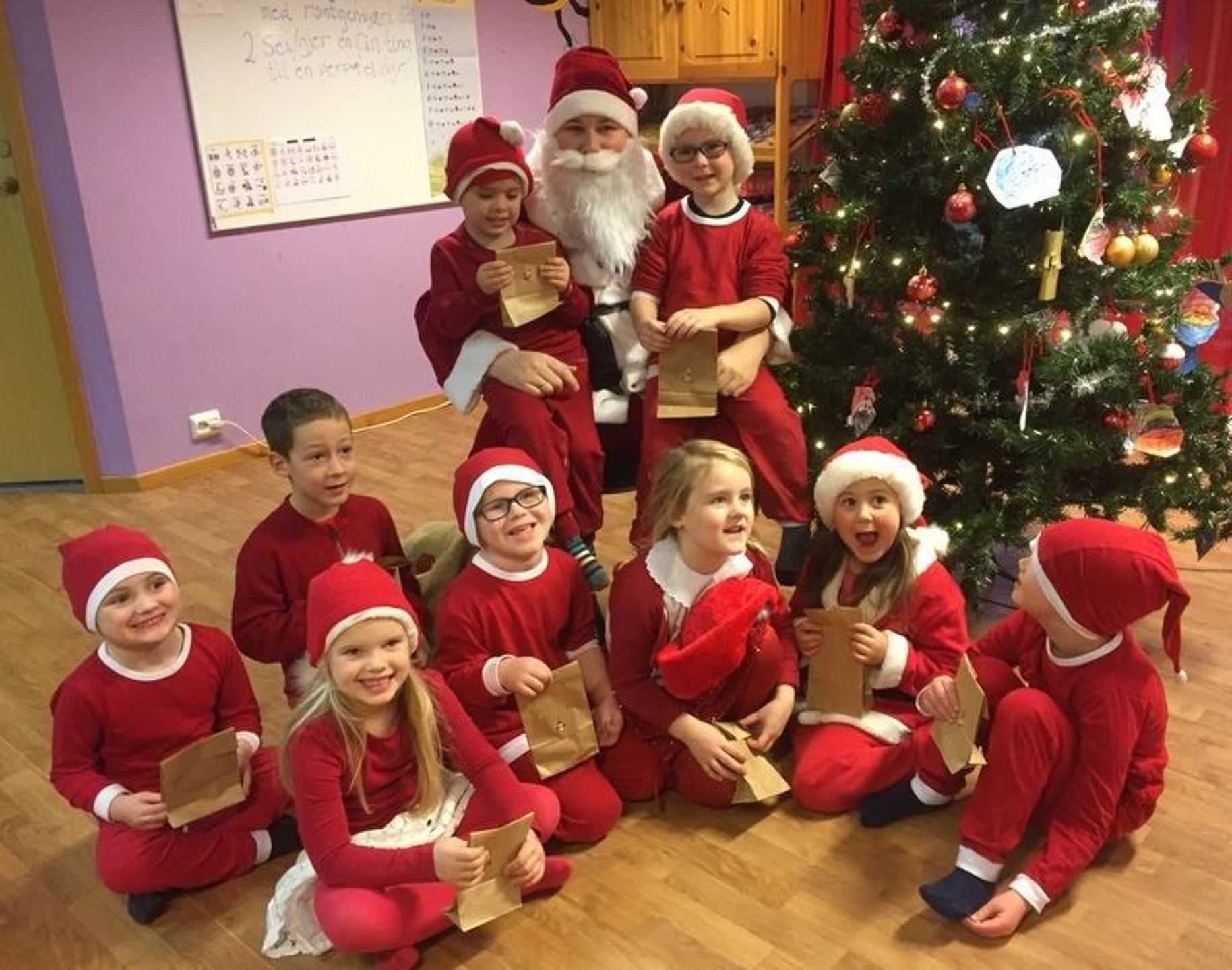 Dei vaksne i barnehagen leste bok for barna. Og det blei gang rundt juletreet. Til lunsj var det nissegraut. Og medan barna sat og åt kom julenissen! Det var veldig kjekt. Han hadde med ei lita gåve til barna, ein sprettball!